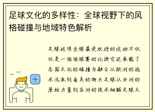 足球文化的多样性:全球视野下的风格碰撞与地域特色解析